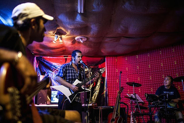 盡管照片中的人顯得很輕松,但對拍攝照片的Fatemi來說卻十分不易。這個攝影師花了數月才被允許進入女性健身房、發廊等。很多人不愿意被拍到臉,怕被認出來;很多人取消了預約,怕因此丟了工作。雖然存在著種種困難,Fatemi還是取得了驚人的成果,為伊朗和外界拍攝了包羅萬象的精美照片。圖為私人搖滾音樂會。搖滾音樂在這里是被禁止的,所以這類表演一般都很隱秘的。