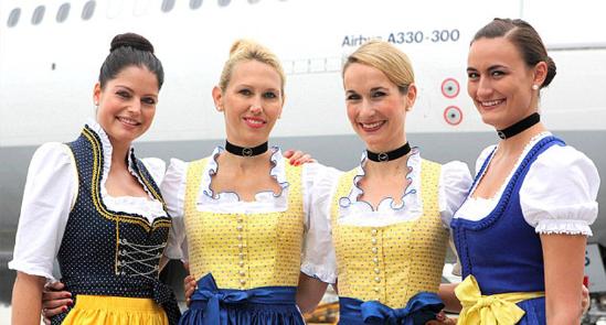 漢莎公司空姐2005年改穿這種巴伐利亞傳統制服,當時恰逢每年一度的慕尼黑啤酒節。2014年,漢莎公司從慕尼黑前往北京、圣保羅以及墨西哥城的長途航班上,乘務員都穿起傳統服裝。空姐穿黃色緊身衣,上面印有藍花,配上藍白相間的裙子。