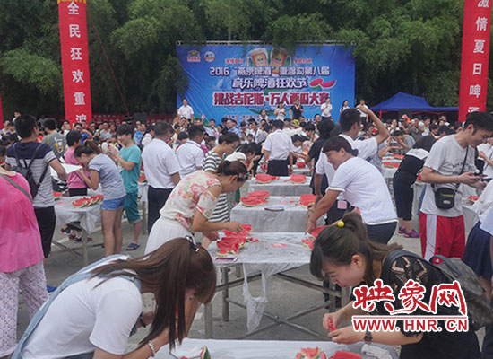 “挑戰吉尼斯 萬人吃西瓜”是由欒川重渡溝風景區和鄭州支點旅游品牌策劃有限公司聯合打造的2016“燕京啤酒”重渡溝第八屆音樂啤酒狂歡節狂歡不停歇第三期主題活動。當日重渡溝景區熱鬧非凡,擺滿誘人西瓜的小方桌次第擺開,翠綠的皮、鮮紅的瓤、瓜香四溢。游客們熱情參與,現場妙趣橫生。有“推土機”式掃蕩吃法,有“生猛”地大口吞咽,有小朋友萌態啃瓜表情十足......真是吃得爽快,玩得暢快,贏得痛快。比賽分為“狼吞虎咽”男子組、“大快朵頤”女子組,每組冠軍將獲得3000元現金大獎。經過淘汰賽、決賽層層激烈角逐,最終比賽決出男女子組一、二、三等獎各一名,所有參賽選手都乘興而來,滿載而歸!“來重渡溝吃西瓜感覺特別甜,特別痛快!從來沒有跟這么多人一起吃西瓜,一口氣連吃三塊還不過癮!”一位游客笑著對記者說。