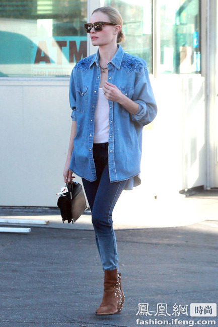 這一套造型讓牛仔成為主導,Oversize的男孩式牛仔襯衫外套最能凸顯帥氣的Boy風格,而和牛仔藍色最百搭的棕色系點綴其中,瘦腿的牛仔褲和上身形成強烈視覺對比,哪怕是披發,也照樣酷勁十足!