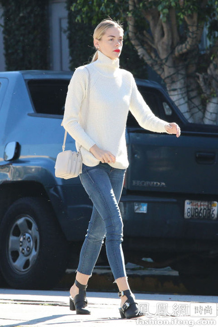 淺色系的針織衫是春季必備的單品,搭配牛仔和珍珠耳環絕對讓你立顯優雅和氣場,緊身的牛仔褲關鍵在于七分長度剛剛好,一雙尖頭的高跟涼鞋讓美腿盡現,整體造型簡潔又時髦!