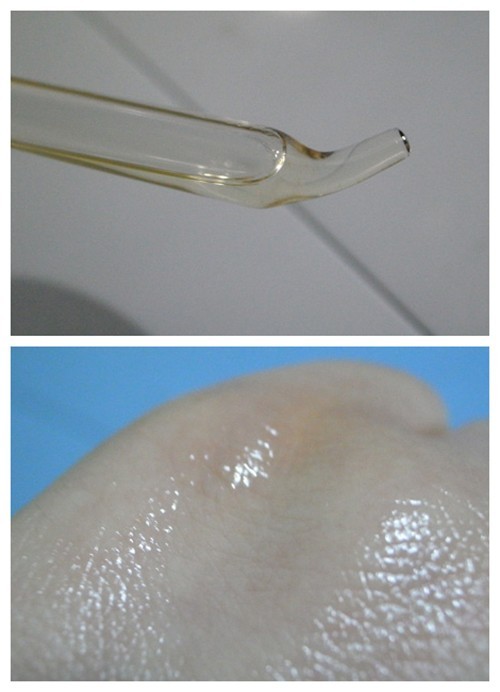 肌膚清潔之后,開始使用彼得羅夫維他命A晚間滋養精華液。PTR小藍瓶是水狀油質的透明無味液體,滴在手背上極易擴散,說明它的流動性很強。稍加按摩,精華液便被完全吸收,滋潤但不黏膩,讓肌膚很有好感。