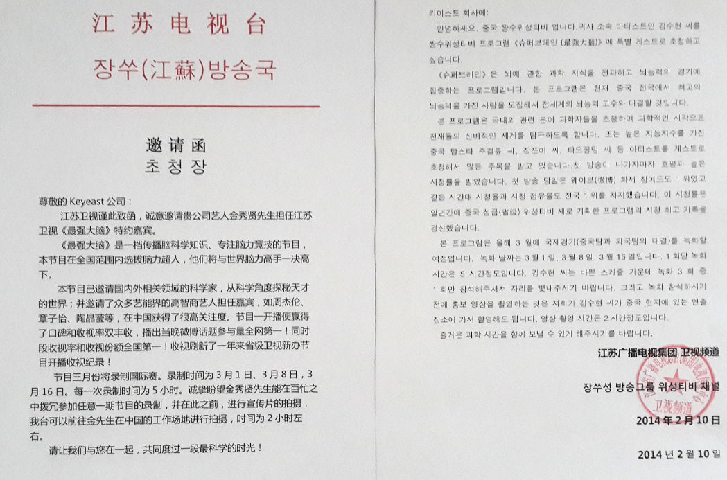 記者在這番邀請函上看到,《最強大腦》節目將于三月將錄制國際賽,錄制時間為3月1日、3月8日、3月16日,每一次錄制時間為5小時。如果此次邀請最終促成,金秀賢將參加其中一場節目的錄制。