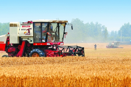 6月9日,收割機正在延津縣搶收小麥。豫北小麥每年收割較晚,單產最高,今年產量有望好于去年。記者 王天定 攝