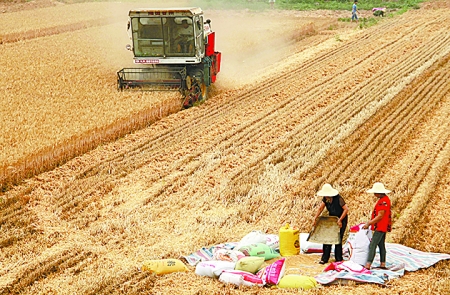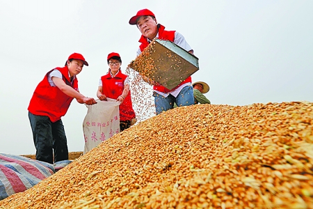 6月7日,在安陽縣倫掌鎮孫家崗村,青年志愿者正在幫助困難戶收麥子。畢興世 李鵬飛 攝