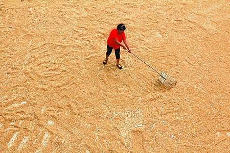 6月9日,內黃縣城關鎮農民在晾曬小麥。眼下,該縣83萬多畝小麥喜獲豐收。劉肖坤 攝