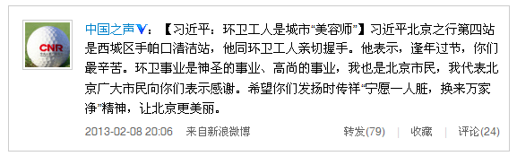 他表示,逢年過節,你們最辛苦。環衛事業是神圣事業、高尚事業,我也是北京市民,我代表北京廣大市民向你們表示感謝。希望你們發揚時傳祥“寧愿一人臟,換來萬家凈”精神,讓北京更美麗。