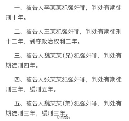 映象網訊 9月26日上午,北京法院網官方微博@京法網事 消息:李某某等5人強奸案一審宣判,其中,被告人李某某犯強奸罪,被判處有期徒刑10年。