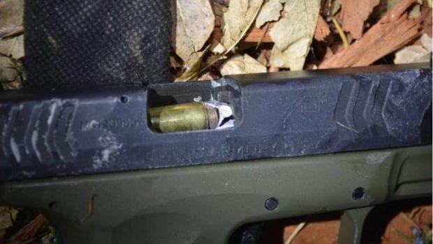 如果美國的陪審團審想問搶劫未遂犯JahlilMeshesha“在去年冬天是否準備武裝搶劫崗杰斐遜縣副警長JoseRamonMarquez”,那么他們只需要看一下上面武器的照片就好了。照片顯示在搶劫犯Meshesha準備開火時,副警長Marquez的子彈射入了搶劫犯的槍管中。圖為搶劫犯的手槍。警察的子彈從槍口射入嫌犯槍支,隨后卡在槍膛中,還將槍膛中的一顆子彈打變形。由于手槍彈頭多是較軟的鉛芯彈,因此有一定概率發生這種情況。