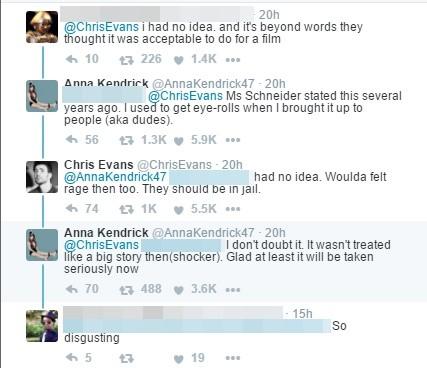 《美國隊長》克里斯·埃文斯(Chris Evans)也表示:“天啊,我再也無法像過去那樣看待這部片子、貝托魯奇或白蘭度,這已經超越了惡心,我覺得很憤怒!”他的發文也引來許多網友認同,連《歌喉贊》女主角安娜·肯德里克(Anna Kendrick)也在底下回應表示,“施耐德女士之前曾在訪談中說過,‘我曾提起過這件事情,聽的人(男人們)還翻白眼’。”