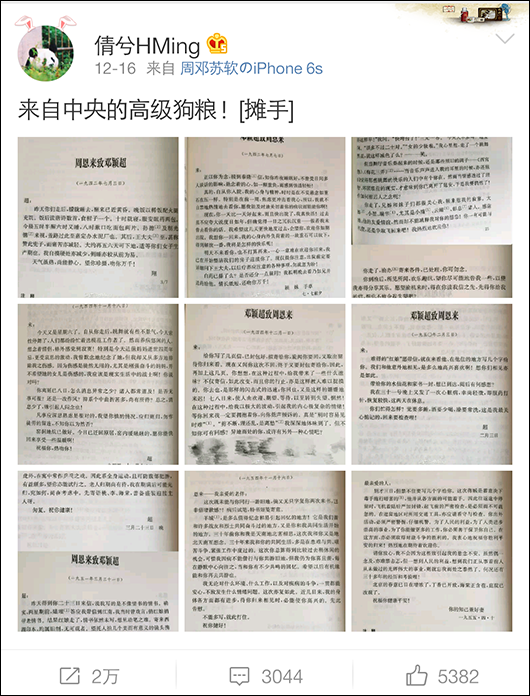 最近,新浪博主@倩兮HMing 送上了這把跨越數十年的,來自中央的高級狗糧:1942至1955年,9封周恩來與鄧穎超的往來書信。