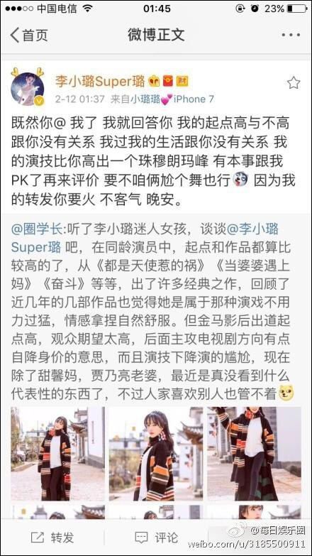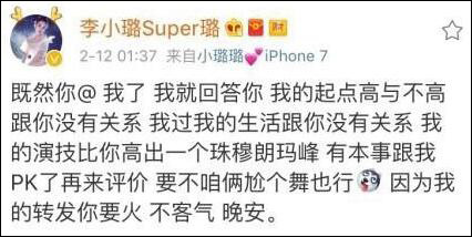 這條微博讓李小璐怒了。李小璐隨后轉(zhuǎn)發(fā)并寫道:“既然你@ 我了,我就回答你,我的起點高與不高跟你沒有關(guān)系,我過我的生活跟你沒有關(guān)系,我的演技比你高出一個珠穆朗瑪峰,有本事跟我PK了再來評價,要不咱倆尬個舞也行,因為我的轉(zhuǎn)發(fā)你要火,不客氣,晚安。”