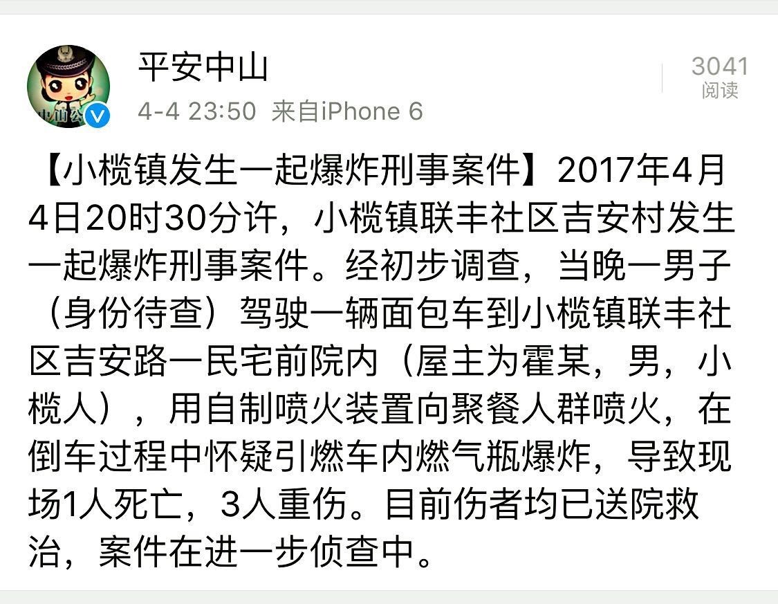 2017年4月4日20時30分許,小欖鎮聯豐社區吉安村發生一起爆炸刑事案件。經初步調查,當晚一男子(身份待查)駕駛一輛面包車到小欖鎮聯豐社區吉安路一民宅前院內(屋主為霍某,男,小欖人),用自制噴火裝置向聚餐人群噴火,在倒車過程中懷疑引燃車內燃氣瓶爆炸,導致現場1人死亡,3人重傷。目前傷者均已送院救治,案件在進一步偵查中。