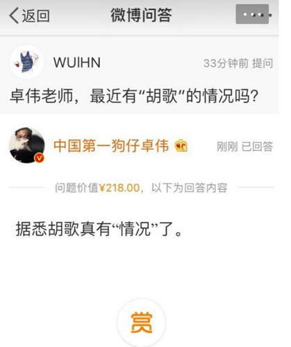 【卓偉回復網友胡歌近況;女友粉大呼心痛:誰這么幸運?】今天不安分的卓偉在微博爆了胡歌的料!稱胡歌最近“有情況”!胡歌的真愛粉和廣大網友一樣氣炸了!總是靠著擦邊球掙錢,太不知所謂了!狗仔不需要職業操守嗎?