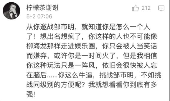 先是向奧運冠軍鄒市明下戰書,就引來很多網友的不滿,被指炒作。