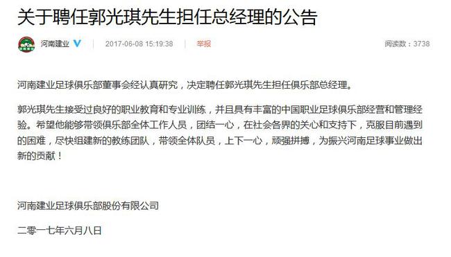 河南建業足球俱樂部董事會經認真研究,決定聘任郭光琪先生擔任俱樂部總經理。