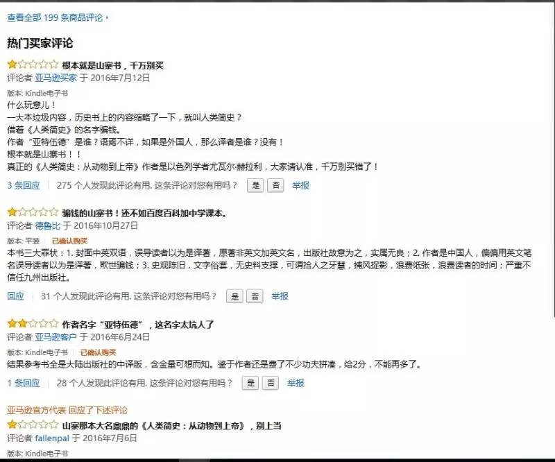 “我居然讀了一本假書。”在豆瓣,一位買到《人類簡史——我們人類這些年》的讀者如此感慨。大量吐槽出現在豆瓣和亞馬遜等平臺,該書在豆瓣評分低至2.5分,并被打上了“山寨”字樣。