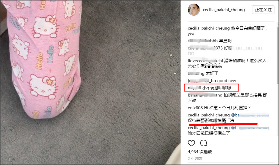 最后喂完貓后張柏芝拿起手機拍攝,這時候貓跳到了小Q的腳上。在鏡頭里面我們意外發現小Q的腳趾甲全部都涂了腳指甲油,而且顏色還是非常亮眼的粉紅色,看來小Q內心保持著一顆少女心啦。