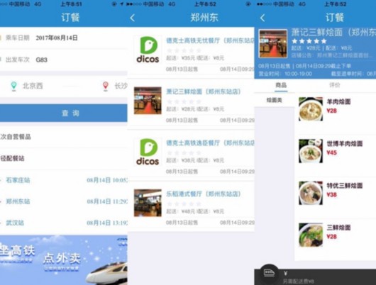 以記者乘坐的G83次列車為例,北京西到長沙沿途共有石家莊、鄭州東和武漢三個停靠站,均可以配送外賣餐食。