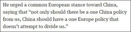 他說:“不能只是要求我們堅持一個中國原則;中國也應當堅持一個歐洲的立場,不能試圖分裂我們。”