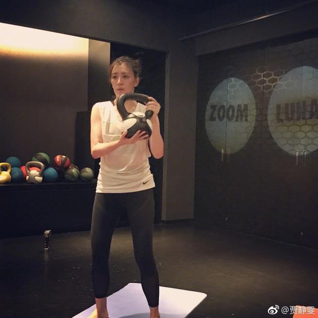 照片中賈靜雯素顏出鏡,身穿白色運動背心加上黑色彈力褲,長發都扎成一個團子束在腦后,舉著一個運動器械正在鍛煉臂力。