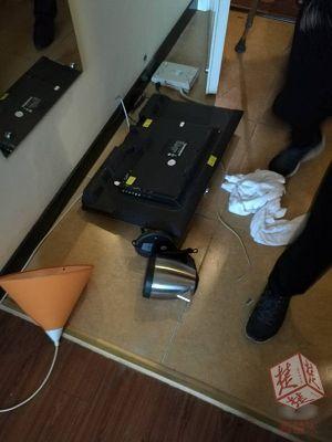 無奈,酒店工作人員只好用樓層房卡將6038號(hào)房打開。打開門,眾人驚呆了!一個(gè)沒穿上衣的小伙子正在玩手機(jī),房內(nèi)的電話機(jī)、電水壺、臺(tái)燈、電視機(jī)都被砸了,甚至連床板都拆了……