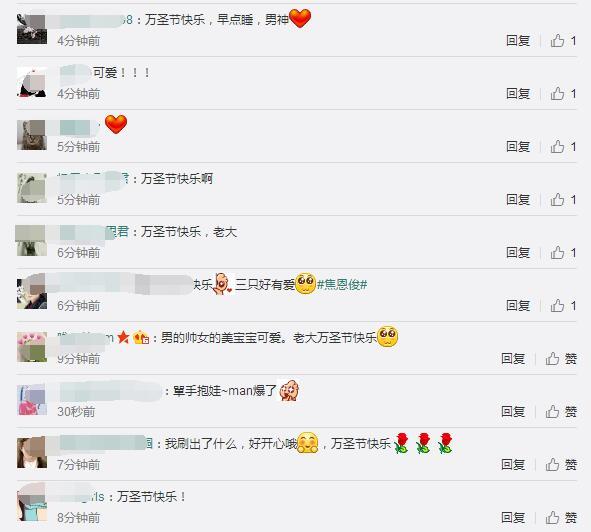 網友也紛紛評論說:“男的帥女的美寶寶可愛。老大萬圣節快樂”、“老大千鈺姐萬圣節快樂!!!我在寫作業里贏來了萬圣節orz……老大晚上早點睡呀,雖然可能會有很多小孩子來敲門說“不給糖就搗蛋”吧,hhhhhhh”
