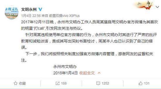 湖南省永州市文明辦官方微博:2017年12月11日晚,永州市文明辦工作人員周某擅自用文明辦官方微博為其喜歡的明星“打call”,引發網友關注與熱議。針對周某違規使用單位官方微博的行為,永州市文明辦對其進行了嚴肅的批評教育和誡勉談話,責成其寫出深刻書面檢討,周某本人也已認識到了自己的錯誤。