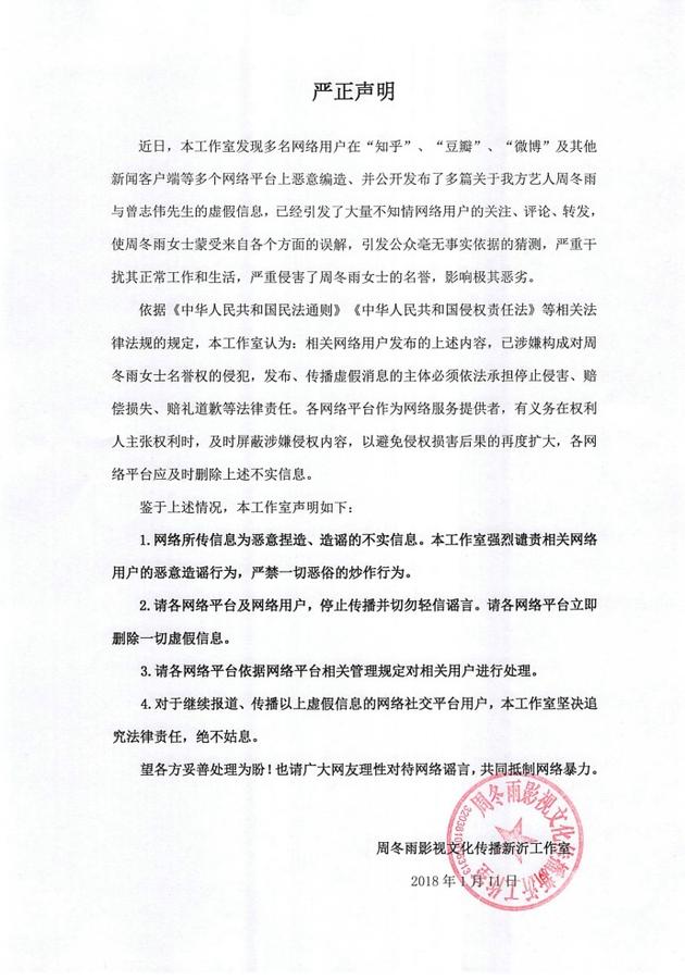 對于此傳聞,周冬雨工作室今天中午發布聲明否認此傳聞,稱此傳聞嚴重侵害周冬雨名譽,影響極其惡劣。表示強烈譴責惡意造謠行為,希望廣大網友理性對待網絡謠言,共同抵制網絡暴力。