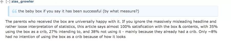有網友說,“許多收到盒子的父母都很滿意,盒子里的東西可以給小寶寶用,而盒子本身還可以當成一個嬰兒床。”