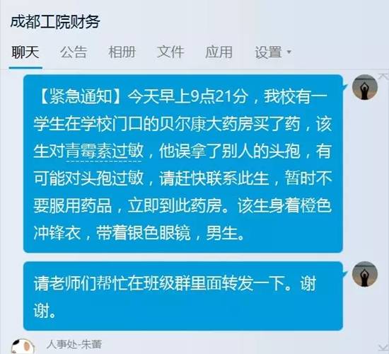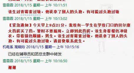 發布的消息內容為:“【緊急通知】今早上9點21分,我校有一學生在學校門口的貝爾康大藥房買了藥,該生對青霉素過敏,他誤拿了別人的頭孢,有可能對頭孢過敏,請趕快聯系此生,暫時不要服用藥品,立即到此藥房。該生身著橙色沖鋒衣,戴銀色眼鏡,男生?!?/p>