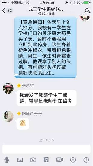 隨即,一場全校上下師生全員大尋找的緊急尋人隨即展開。校方在學校各個平臺及所有輔導員群將該消息發布出去,同時通過短信平臺向所有在校學生群發短信,希望找到該名拿錯藥的學生。