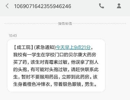15日上午10時03分,成都工業學院接到了校門口一藥房的求助:一名戴銀色眼鏡,身著橙色沖鋒衣的學生在結賬時誤拿了別人頭孢藥,因其告訴工作人員對青霉素過敏,如服用將可能產生嚴重后果。