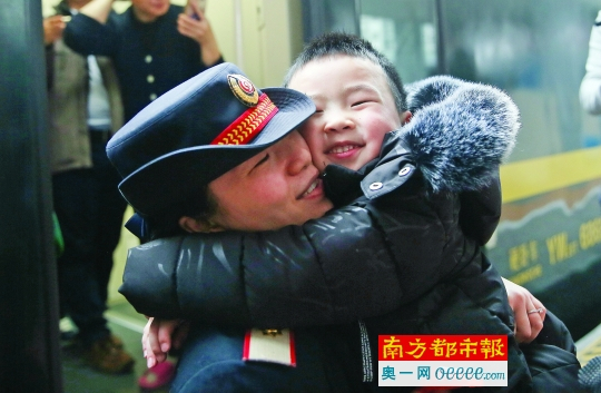 2月10日16時57分,深圳開往烏魯木齊的Z 230次列車停靠衡陽站,由知名導演陳可辛執導的短片《三分鐘》原型列車員劉鐘與兒子丁丁在站臺短暫相聚三分鐘。緊緊的相擁后告別在即,劉鐘眼中含淚,她還要上班至15日。不過,讓劉鐘特別開心的是今年她終于可以回家過除夕,這是11年來第一次。 南都記者 馬強 攝