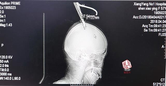 醫生檢查發現,剪刀刀尖斜嵌在沈某顱骨里,離腦髓只有兩三毫米。所幸是斜著插進去,如果是垂直刺入,很有可能造成癱瘓。