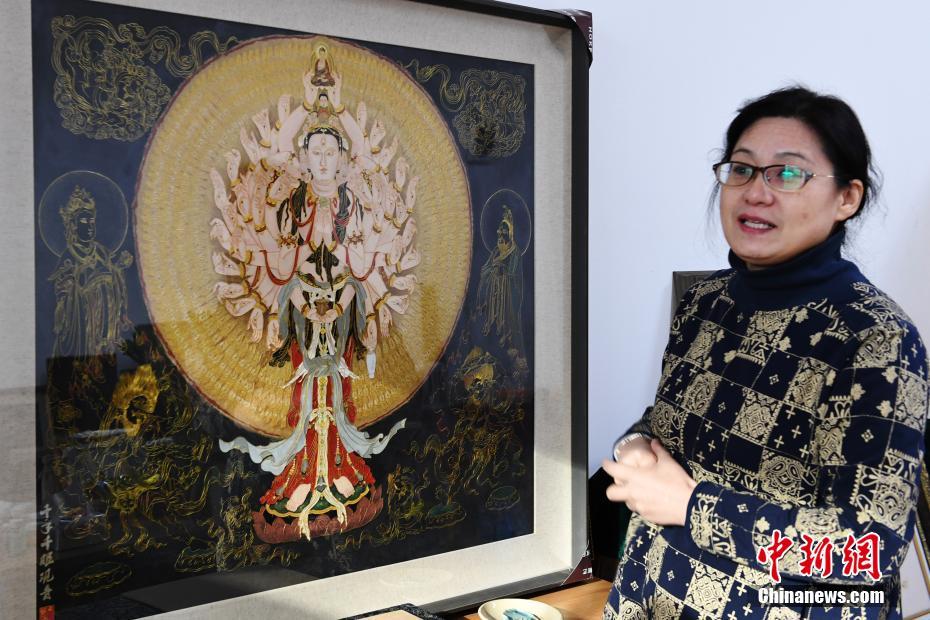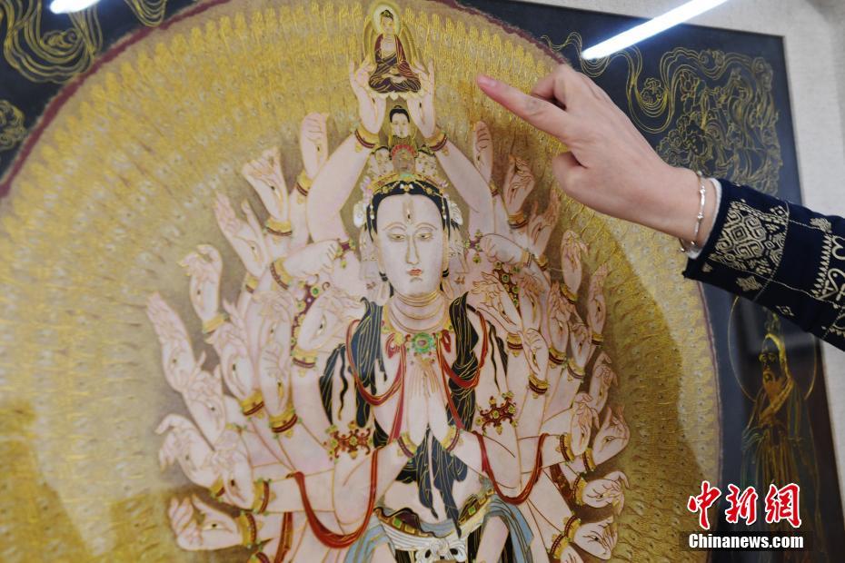 4月7日,蘭州文理學院女教師白茜介紹自己用萬根金屬絲創作出的“千手千眼觀音”掐絲琺瑯畫。從小喜歡繪畫的白茜通過自己十幾年的摸索,以敦煌壁畫為范本制作掐絲琺瑯畫。“千手千眼觀音”是白茜最滿意的作品,用了萬根一米左右的金屬絲臨摹完成。