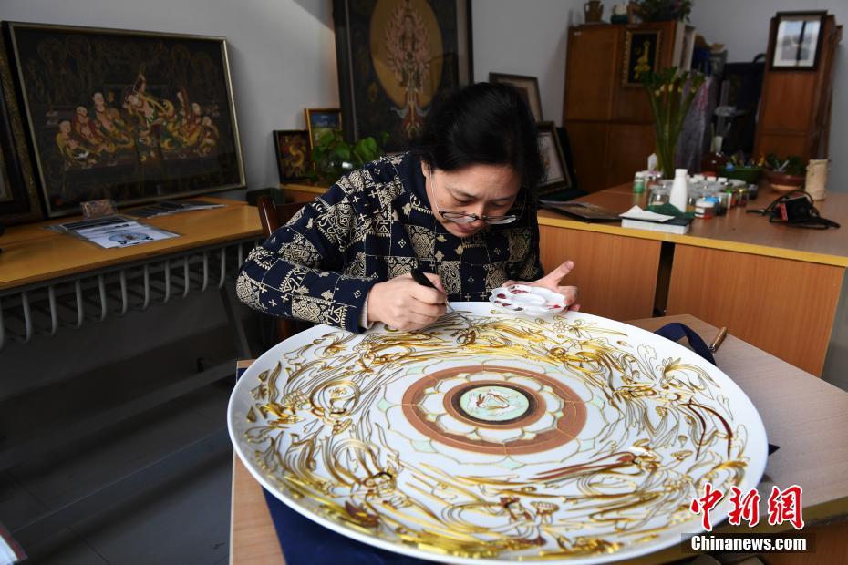 4月7日,蘭州文理學院女教師白茜用金屬絲在瓷盤上創作掐絲琺瑯畫。中新社記者 楊艷敏 攝