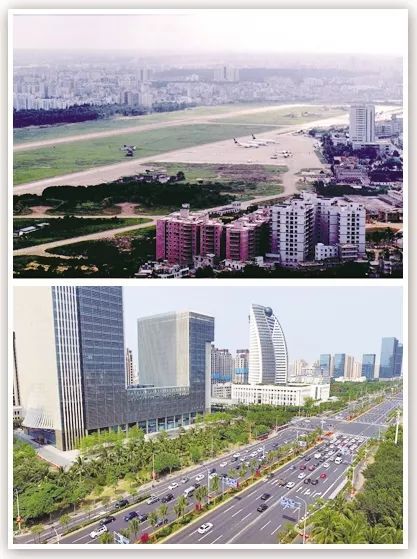 拼版照片為海口市國興大道,曾經(jīng)是海口大英山機(jī)場(chǎng)(上圖為1999年5月新華社記者姜恩宇攝,下圖為2018年4月14日新華社記者郭程攝)。 新華社發(fā)