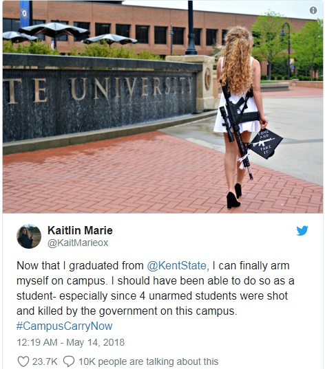 報道稱,凱特琳·班內特畢業于位于俄亥俄州的州立肯特大學,取得了生物學學位。畢業后的第二天,這名22歲的女孩返回校園,肩背一把AR-10半自動步槍,手拿頂上印有“有膽來拿”字樣(美國獨立戰爭的口號)的畢業帽,還拍了照并發到了網上。