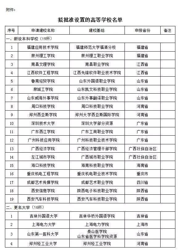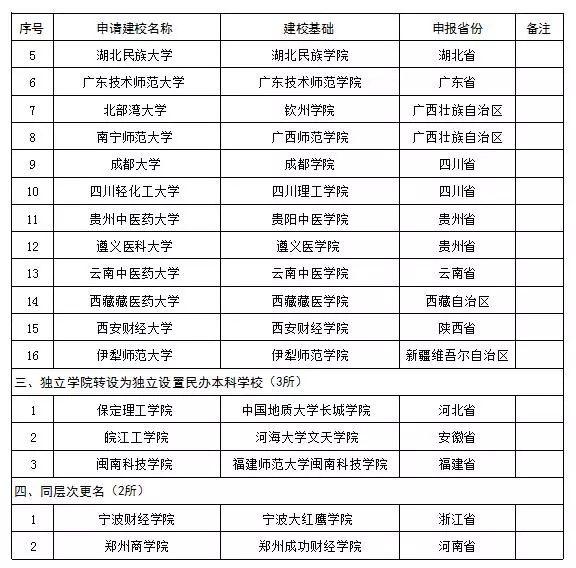 教育部擬批準設置的高校名單如下: