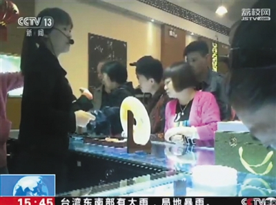 6月15日,央視“新聞直播間”節目中,游客在珠寶飾品店內選購商品。視頻截圖