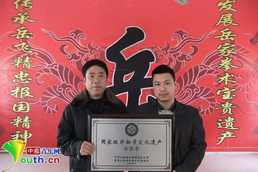 2008年,岳家拳正式被國務院批準為國家級非物質文化遺產。張業金(左)與張奇鋼(右)從北京捧回岳家拳非遺匾。