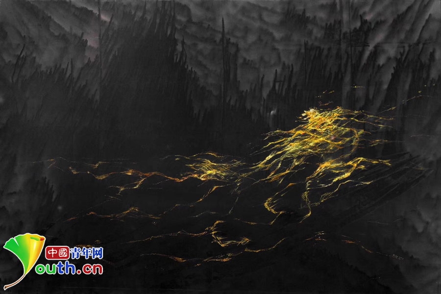 金線用蘇繡典型的平針繡法繡在真絲底料上,明暗金黃色從近處向遠處延伸,燈光照射下,一如夜空中的萬家燈火。若有燈光照射,參觀者會發現整個底料上還暗藏一幅潑墨山水畫。