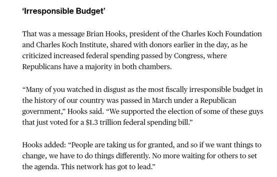 另外,科赫兄弟還表示他們不會再向以前那樣輕易支持共和黨的議員了,因為這些議員并沒有履行他們競選時的承諾,反而是一直在支持美國政府的一些違背市場的政策,比如在今年3月的一項加大政府財政開支的法案。