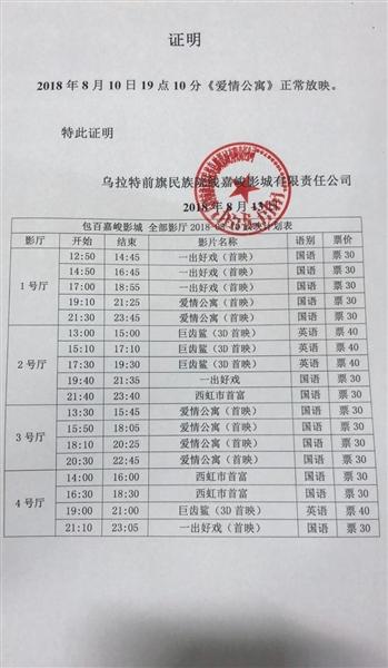 新疆塔爾巴哈臺影劇院發了一個說明函:2018年8月10日,上午10:19,涉事觀眾(即上文鄭先生)在我院購買了兩張20:30《愛情公寓》的影票,晚上19:42該觀眾到前臺要求售票人員將兩張20:30的《愛情公寓》更改為兩張20:05的《一出好戲》。售票員在未經值班領導同意的情況下,私自更改了影票場次,造成了不好的影響,我院將對售票人員嚴肅處理,敬請片方給予諒解。