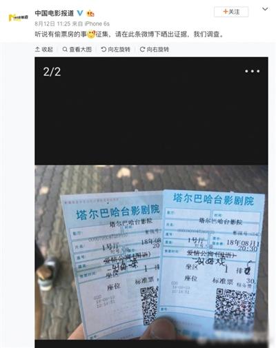 8月12日下午,CCTV6電影頻道旗艦欄目官方微博中國電影報道發微博稱,“聽說有偷票房的事,征集,請在此條微博下曬出證據,我們調查?!迸鋱D中,是兩張《愛情公寓》的電影票,但電影名字被人工劃掉改成了《一出好戲》。在該微博的評論區,也有不少網友聲明自己遭遇同樣狀況。接著,“愛情公寓涉嫌偷票房”的話題迅速登上熱搜榜。