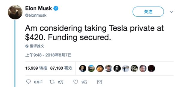 當地時間8月7日,馬斯克發推表示,正考慮將特斯拉以每股420美元(對應市值約720億美元)的價格將其私有化,并且資金已經到位。