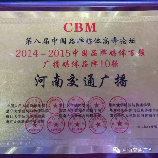 FM1041河南交通廣播榮獲2014-2015中國品牌媒體百強廣播媒體品牌10強。在河南廣播媒體中,僅此一個。這也是對河南交通廣播在節目、活動、服務方面成績的肯定。