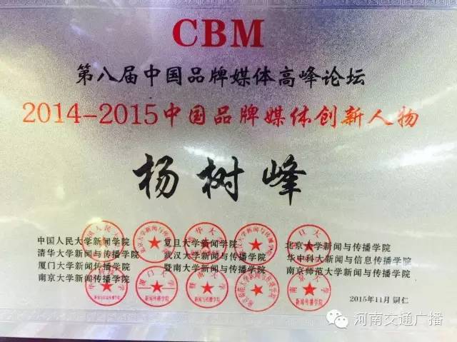 本屆論壇上,河南交通廣播總監楊樹峰榮獲2014-2015中國品牌媒體創新人物稱號,這是對他個人成就的肯定,更體現了河南交通廣播運管機制的成功,人文關懷、扁平化管理,民主決策、智慧碰撞,從決策層發出的指令,成為掌控河南交通廣播精準運行,走向成功的靈魂,而我們一切的努力,都是為了實現一個目標:無論何時、何地,無論現在、未來,伴你出行每一刻。