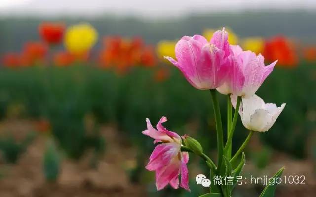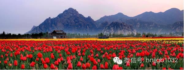 在嵖岈山天磨湖景區外,有著近300畝約有100多萬株的荷蘭郁金香種植基地,顏色多達36種之多。